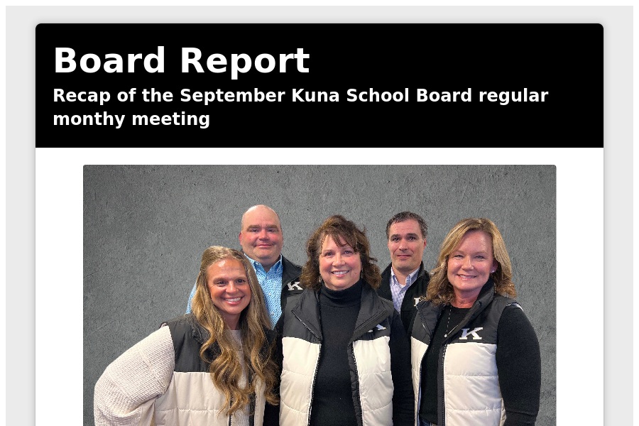 Board Report Recap of the September Kuna School Board regular monthy meeting September highlights The Kuna school board met on Tuesday, Sept. 9, 2025 Wa. . .